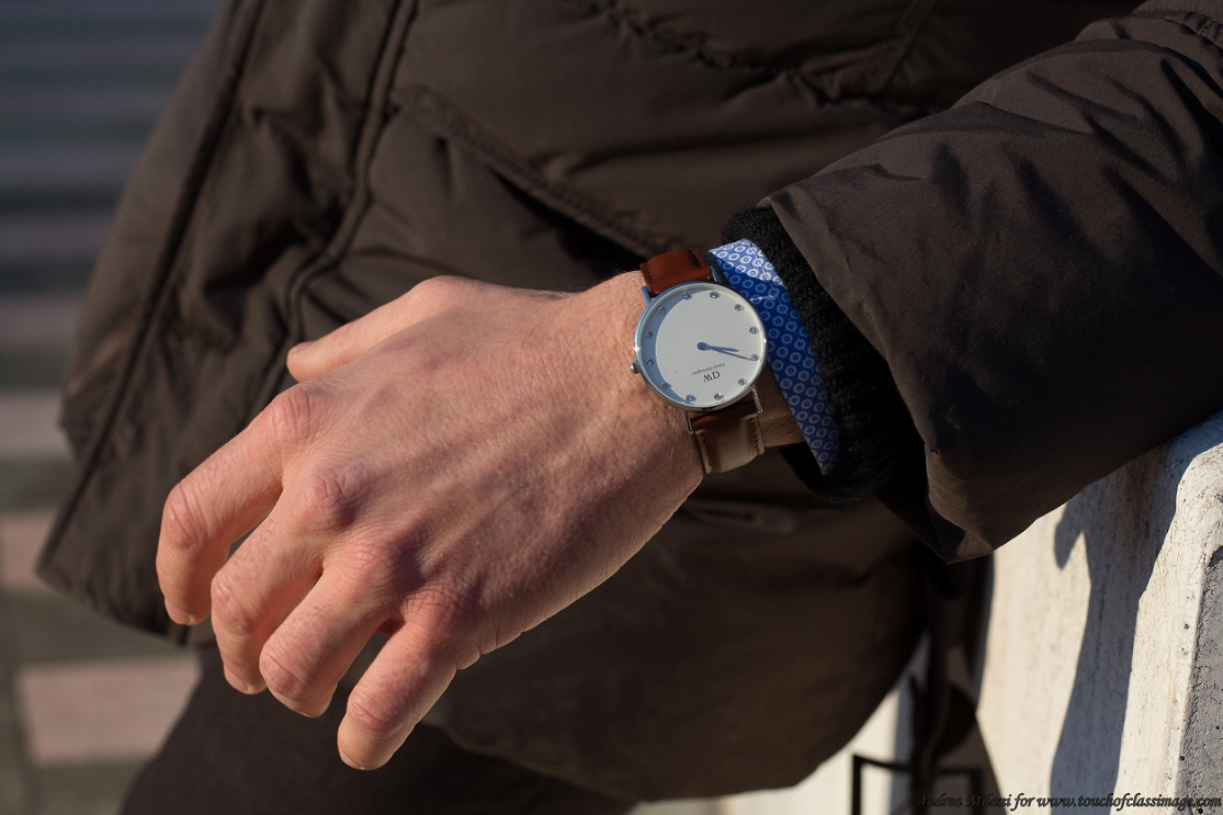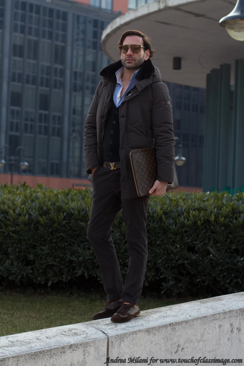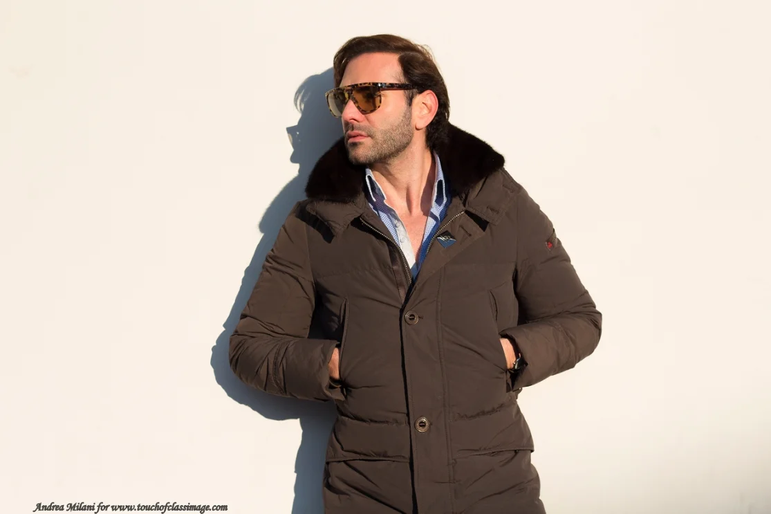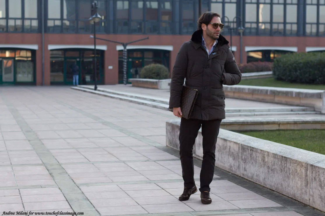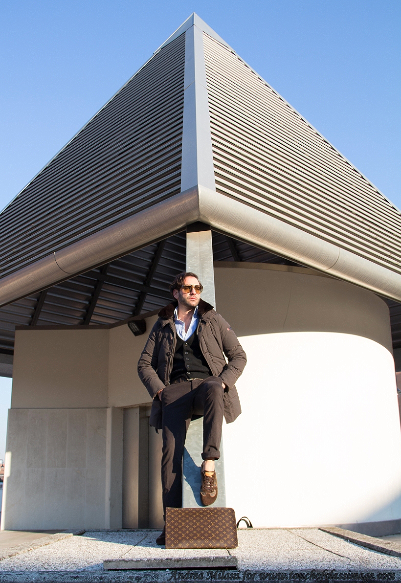 Occhiali: Gucci / Giaccone: Peuterey / Maglione: Yves Saint Laurent / Cintura: Louis Vuitton / Pantaloni: Zara / Scarpe: Louis Vuitton / Anello: Cesare Paciotti Jewels / Orologio: Daniel Wellington / Camicia: Nara Camicie