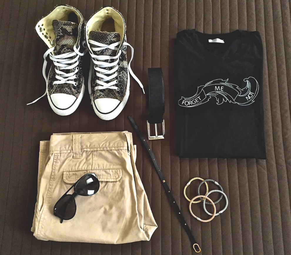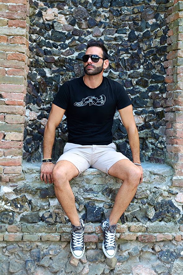 Occhiali: Dolce & Gabbana / T-shirt: Dior / Pantaloni: Benetton / Cintura: Dior / Scarpe: Converse Mod.All Star / Bracciale: Romantirock