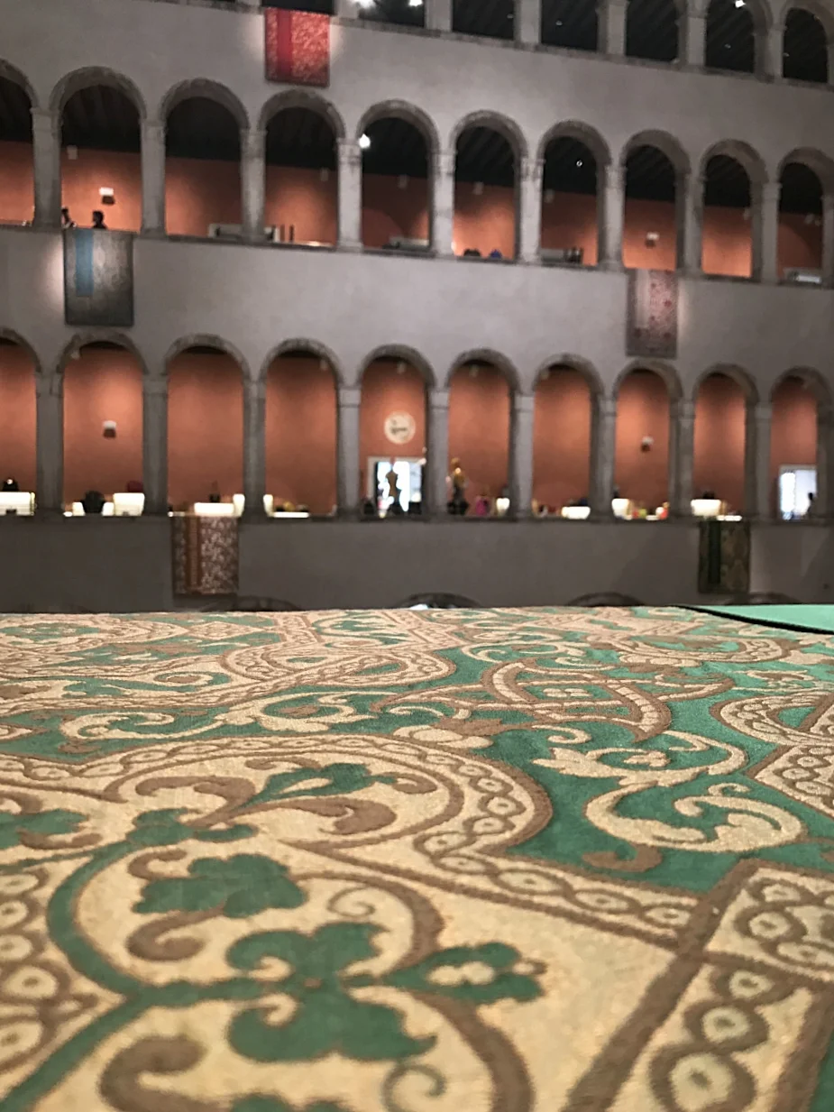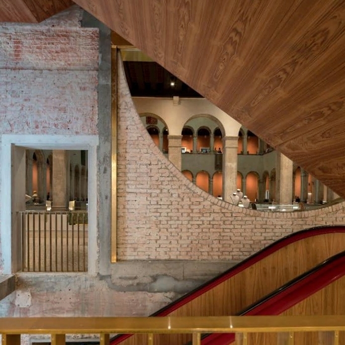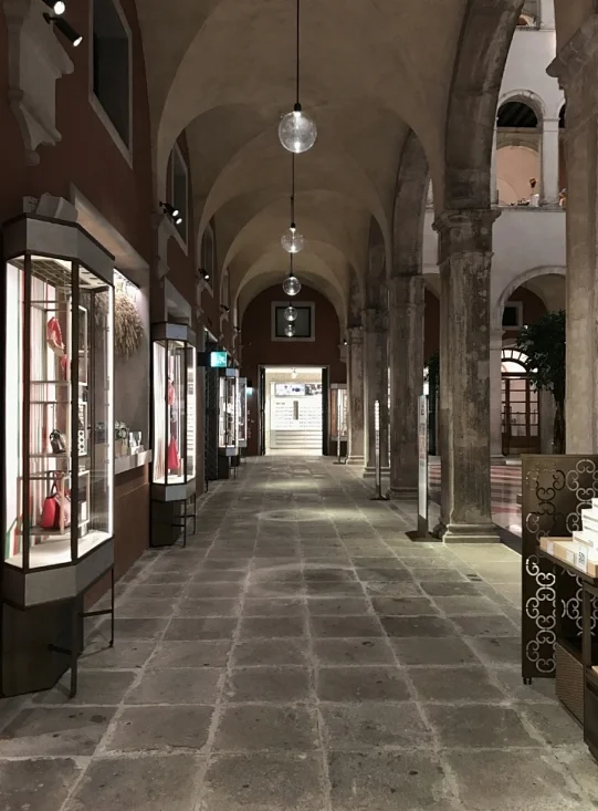 Una complicità tra arte e storia fuse con il concetto di shopping del nuovo millennio, 7000 metri quadrati spalmati su 4 piani, dove le scale mobili si amalgamo perfettamente con le travi a vista dei soffitti, mentre i pavimenti in terrazzo veneziano e le colonne dei porticati (tipici dell’architettura veneta) su cui fanno capolino le scritte incise dai mercanti che nel passato hanno animato questo luogo, permettono di respirare la storia e il fascino antico di questo luogo.